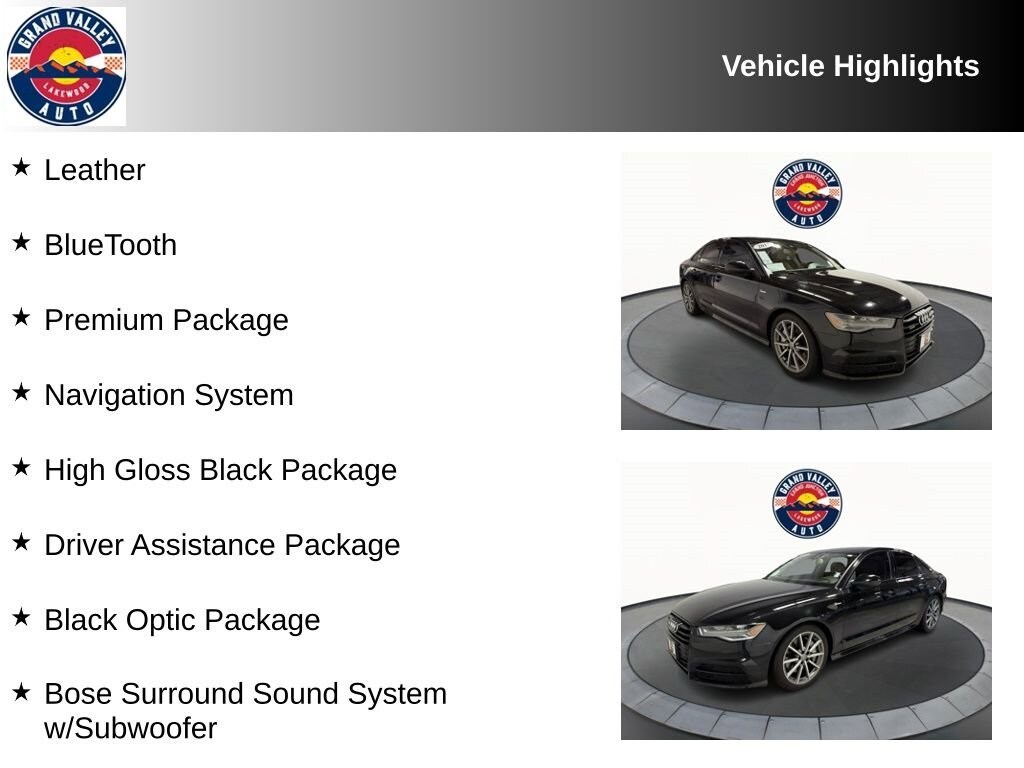 Offered in eye-catching Brilliant Black, our Accident Free 2017 Audi A6 3.0T Prestige quattro Sedan features brilliant performance and remarkable versatility. Powered by a SuperCharged 3.0 Liter V6 delivering 333hp paired with an 8 Speed Automatic transmission that takes you to 60mph in just 5.1 seconds. This All Wheel Drive sedan scores nearly 29mpg on the highway and looks sleek and contemporary with a stunning silhouette enhanced by a power sunroof, LED headlamps, S Line bumpers, and attractive wheels.